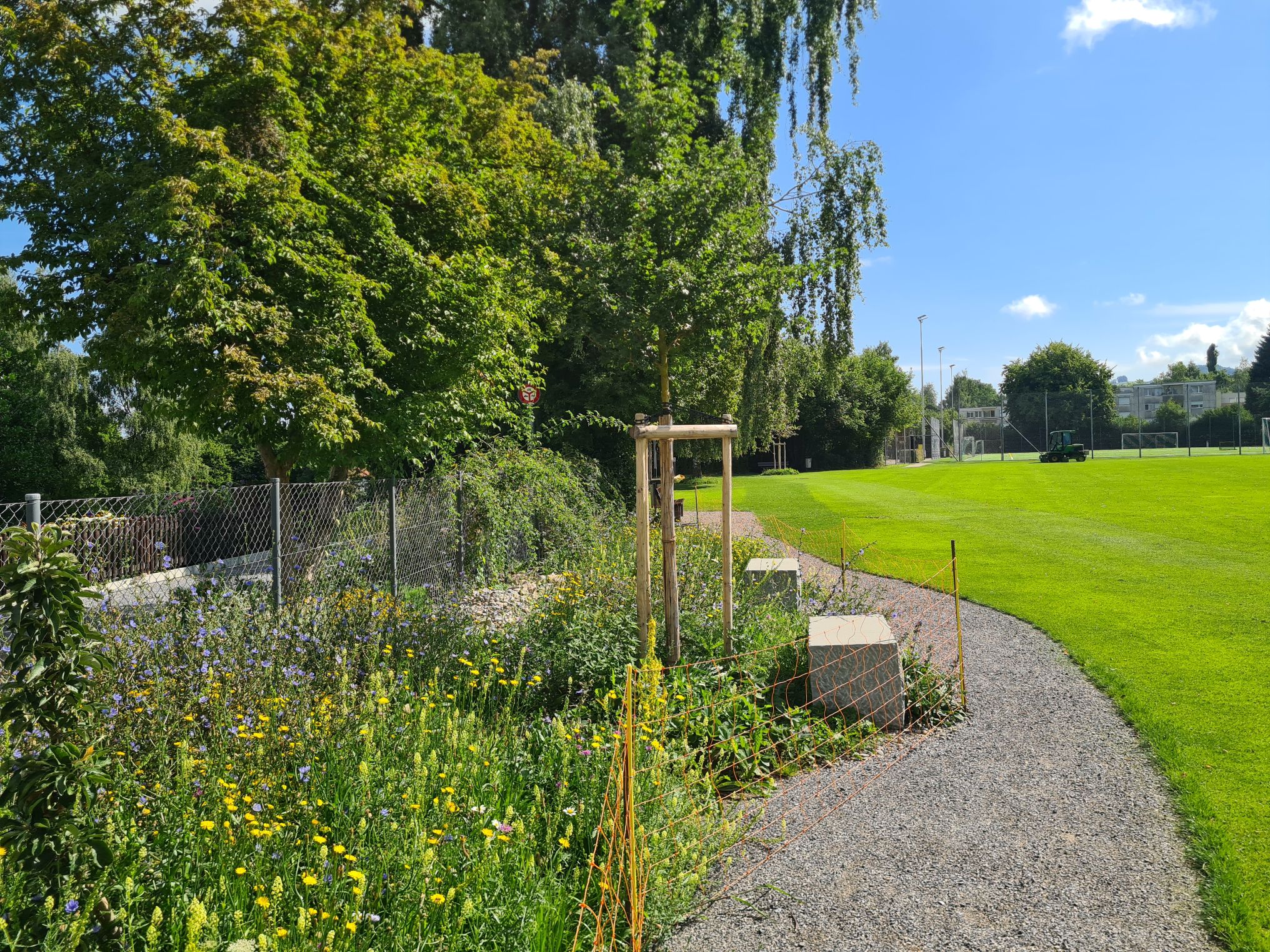 In der Spiel- und Sportanlage Grütliweg befand sich eine grössere Rasenfläche, welche kaum benutzt wurde. Diese Fläche wurde mit Heckenpflanzungen, Wildblumenwiesen, wechselfeuchten Standorten, Ruderalbepflanzungen, einzelnen Baumpflanzungen und Kleinstrukturen ökologisch aufgewertet. In einem Bereich wurde ein Naschgarten mit Sitzgelegenheiten geschaffen, sodass Besuchende verweilen und die Naturvielfalt erleben können. Bei der Umgestaltung wurde auch die nähere Umgebung miteinbezogen und die Umwandlung von Formschnitthecken in Wildhecken realisiert. Die Ziele sind eine ökologisch wertvolle Umgebungsgestaltung mit einer Vielzahl unterschiedlicher Lebensräume und das Erlebbarmachen der Natur in der unmittelbaren Umgebung des Spiel- und Sportplatzes.